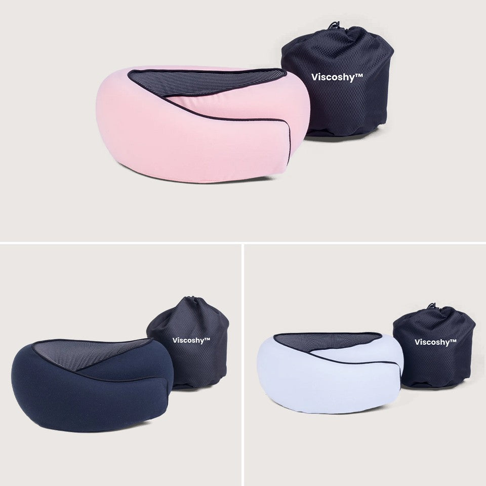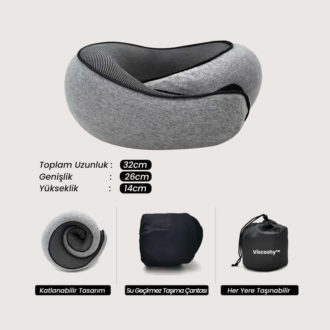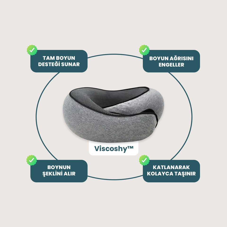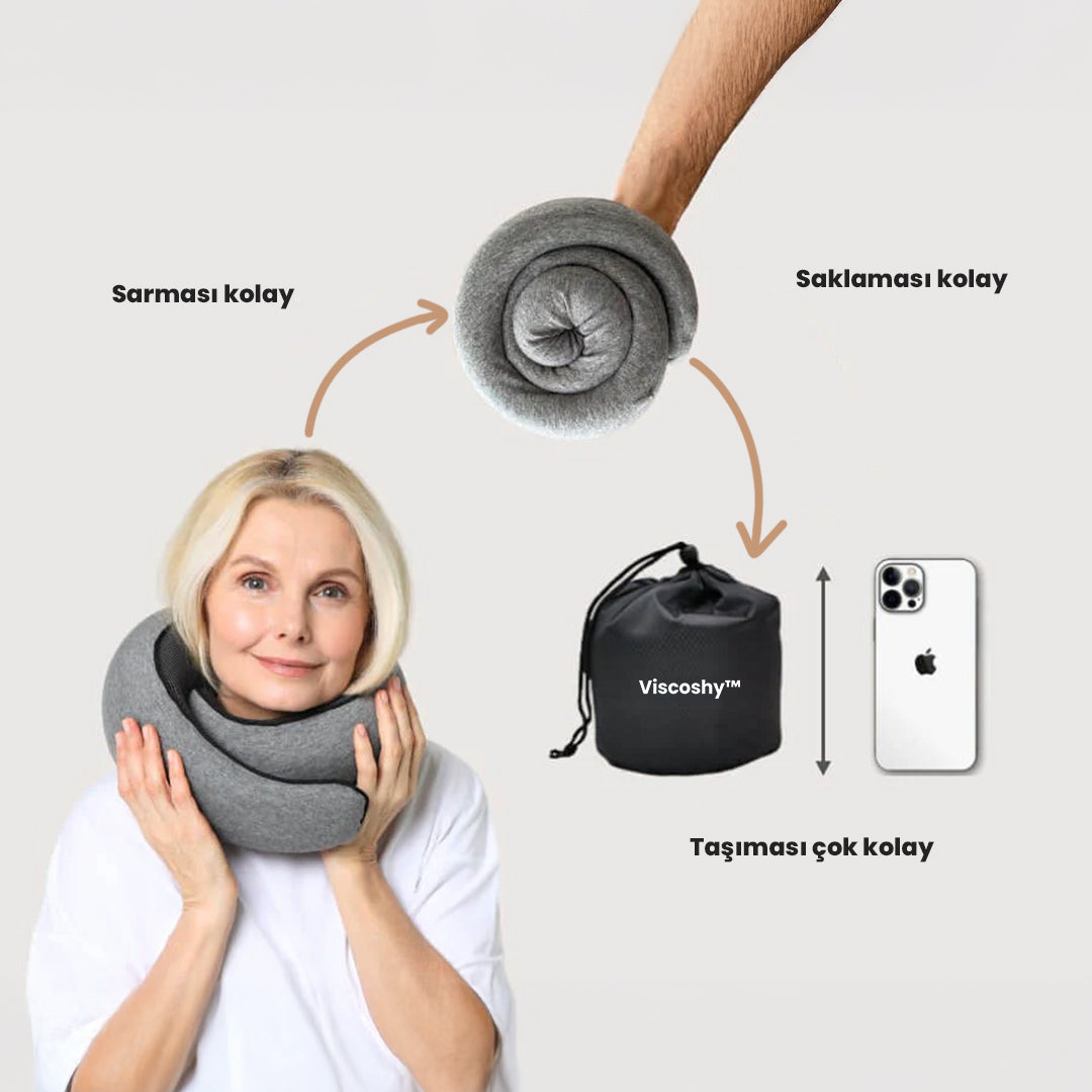 Viscoshy™ Seyahat Yastığı, sizi sıradan yastıkların eksik konforundan kurtarır. Özel boynunuzu 360° saran tasarımı sayesinde başınızı sabitler, boynunuzu tam sarar.Visco dolgusu sayesinde yumuşak ama güçlü bir destek sunar. Uçakta, otobüste, hatta kısa mesafeli yolculuklarda bile rahatça uyuyabilir, indiğinizde yenilenmiş hissedebilirsiniz.